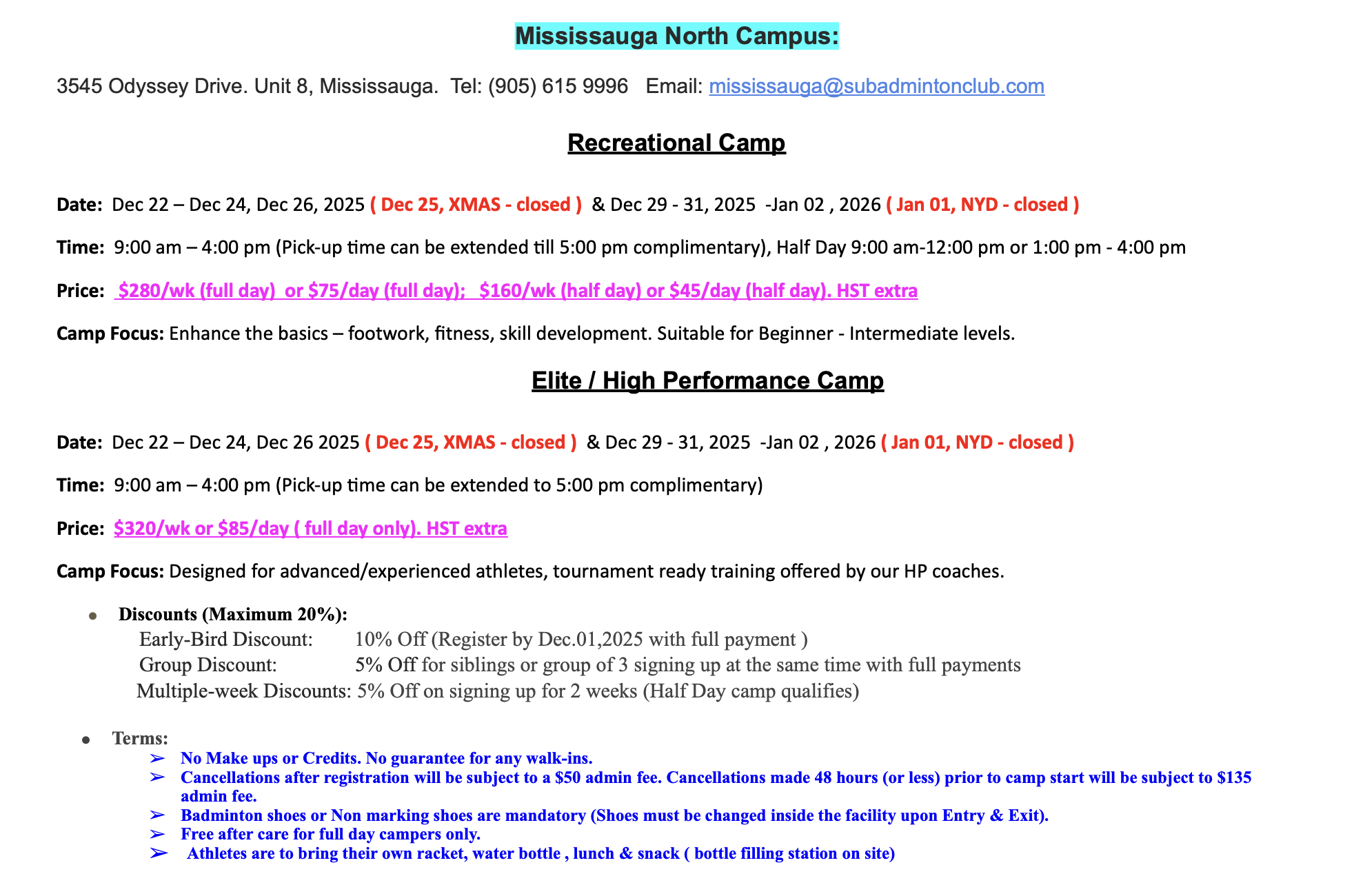 Mississauga North Campus will be conducting Summer Camp in High Performance and Recreational categories
